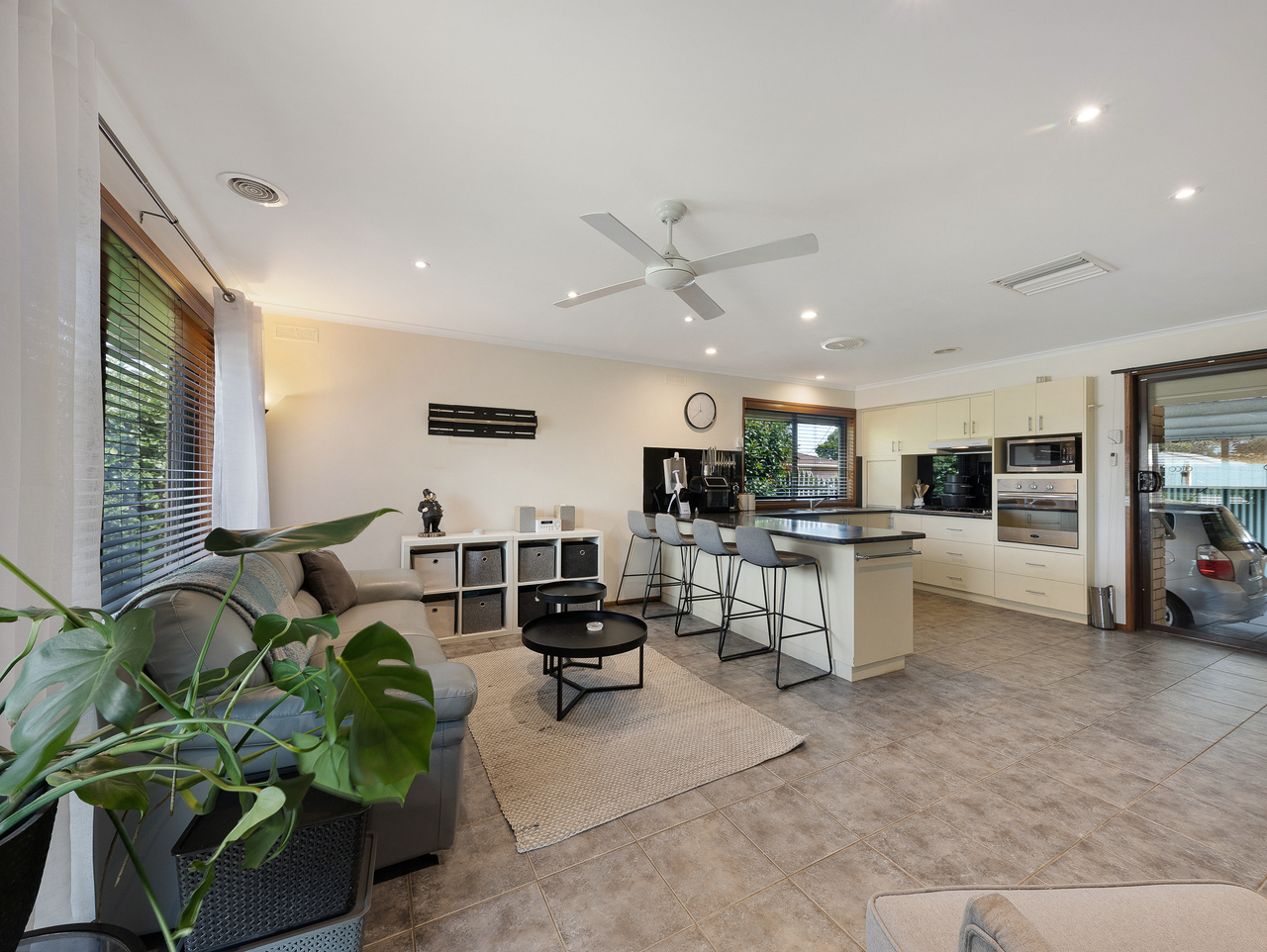 Open plan living/meals area adjoining the updated kitchen with stainless gas cooking, dishwasher, oven, and breakfast bar.