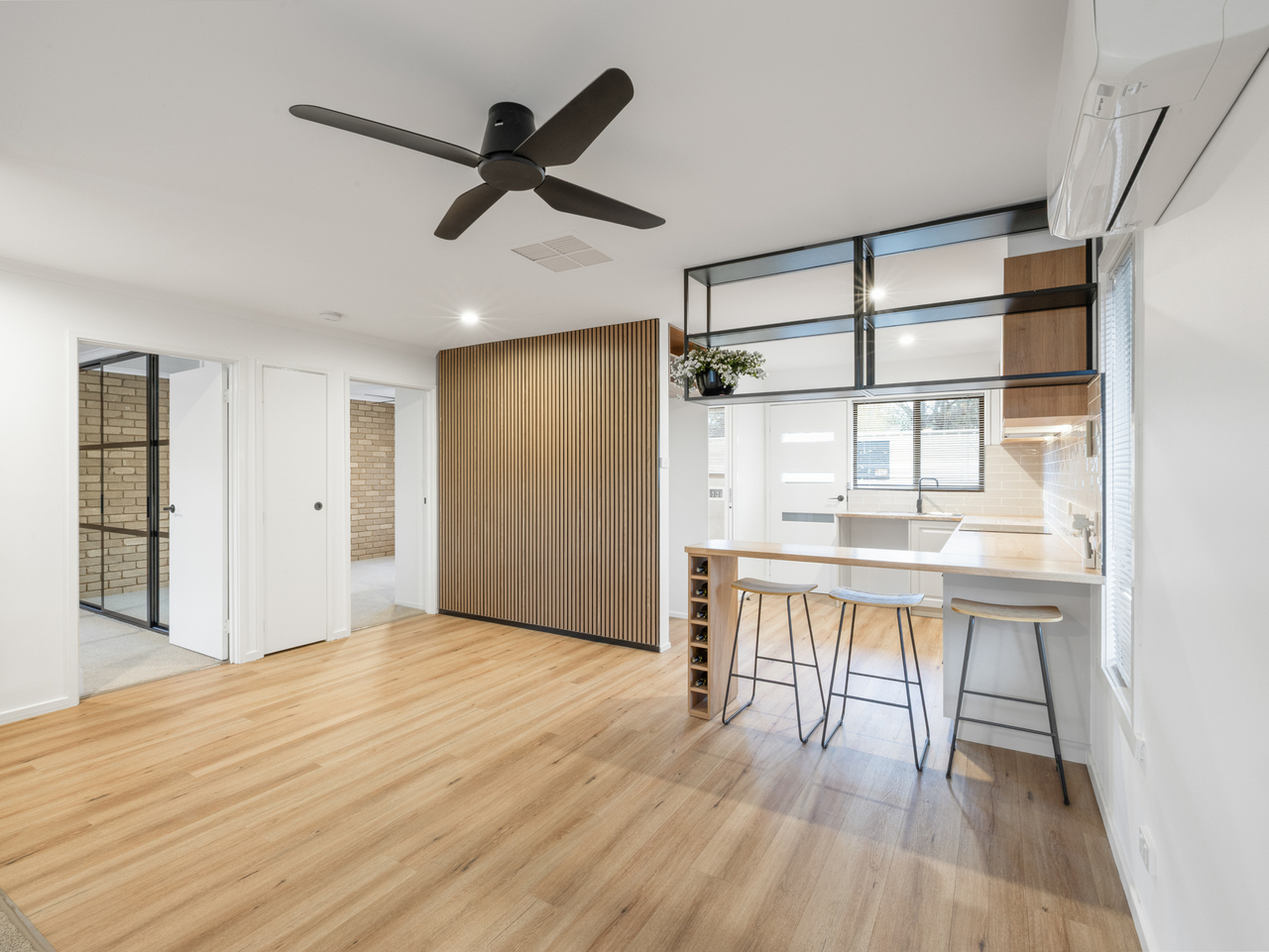 Featuring a fully renovated kitchen with Bosch oven and electric cooktop, subway tiled splash back and a combination of draws, cupboards and open shelving. The combined bathroom / laundry includes large walk-in shower, generous vanity and shaving cabinet with lots of storage. Two bedrooms, both have built in robes. With updated floor coverings and modern window furnishings, the interior is bright and contemporary. Heating and cooling is well taken care of with a split system located in the main living area, along with gas wall heater and evaporative cooler. Matte black ceiling fans throughout provide both style and comfort.